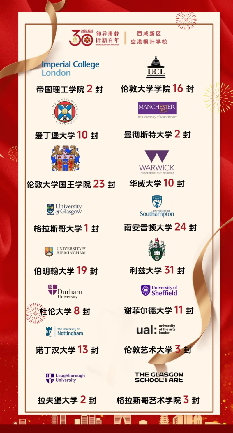 九载耕耘,硕果累累!2025届学子以实力书写传奇,今年,本校又实现一重大录取突破,世界十强大学(帝国理工学院QS第二、伦敦大学学院QS第9)录取达18封,录取率高达24%,续写枫叶教育的辉煌篇章!
