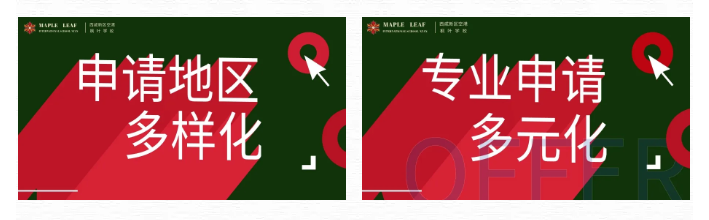 枫叶世界学校课程毕业生多国同申,学子收获多国多封offer。其中包括荷兰的阿姆斯特丹大学、韩国的庆熙大学、意大利的米兰新美术学院等。