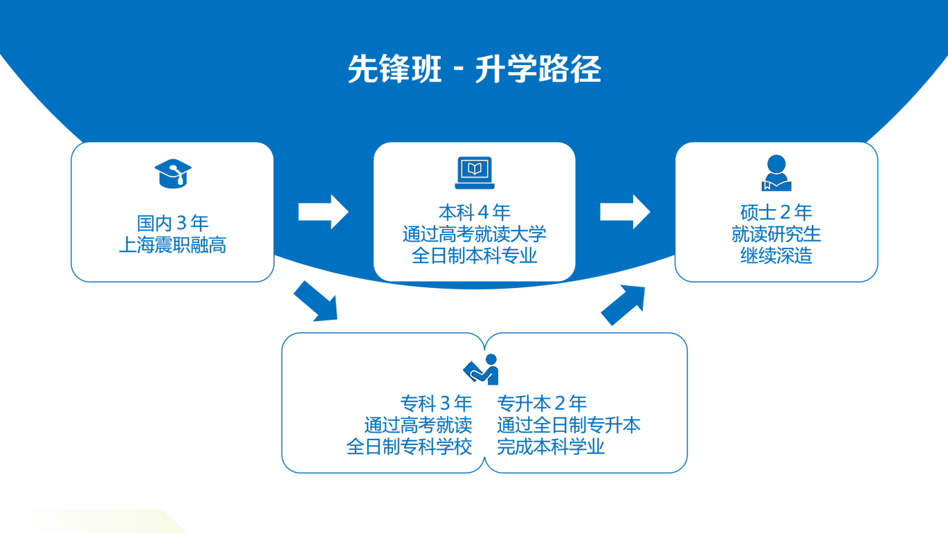 就读三年课程后,沪籍学生可参加上海自主招生考试或六月统招高考,非沪籍学生回户籍所在地参加六月全国统一高考报考全日制专科院校或本科院校。(其中第二年班主任协助学生回户籍所在地资格审核报名,第三年回户籍所在地参加考试,具体情况根据当地当年高考报名政策而定。)