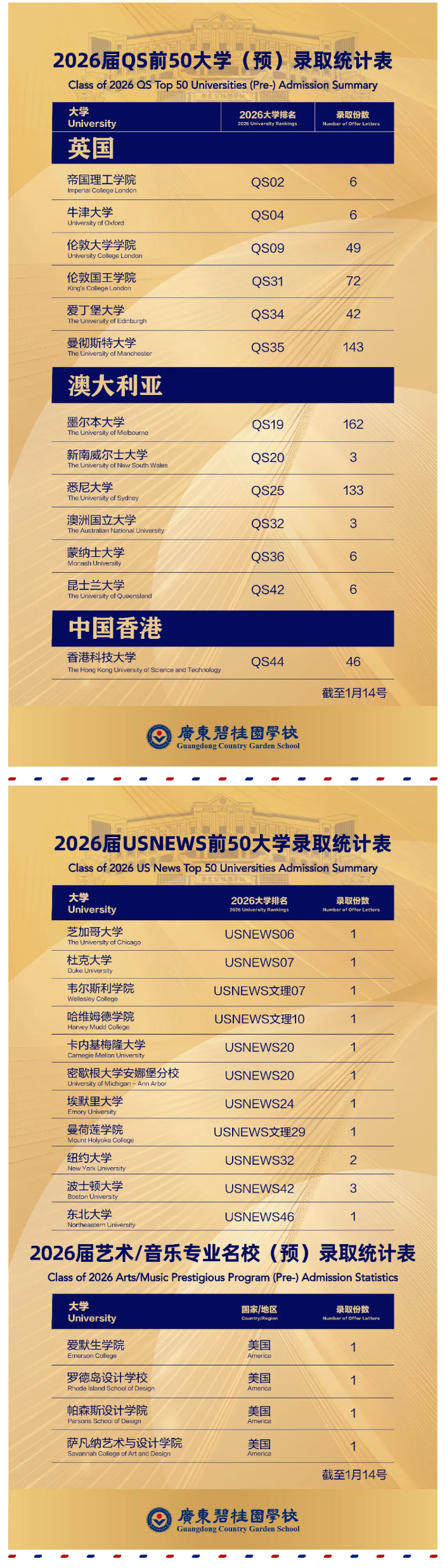 截至1月14日,广碧共计收到USNews美国TOP50大学和QS世界TOP50大学以及艺术\音乐专业世界TOP5大学offer695份。