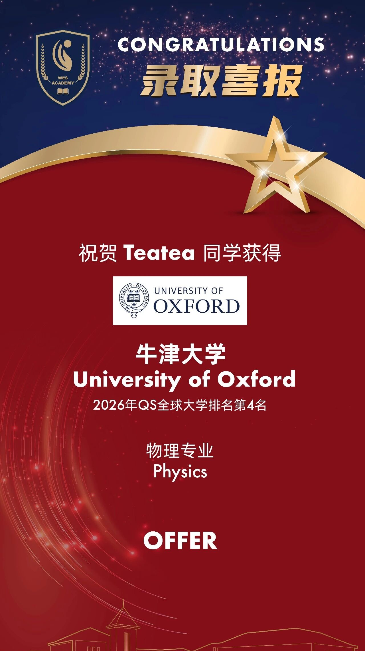 恭喜本校学子Teatea成功通过牛津大学物理专业面试并获得预录取!
