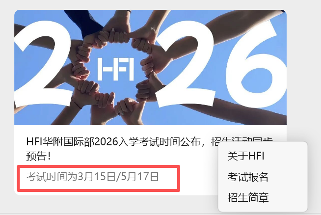 华附国际部正式发布2026学年入学考试时间:两场考试分别定在3月15日、5月17日,时间上整体和去年变化不大。