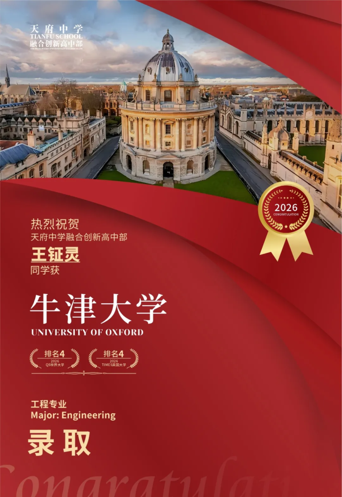2025 年,天府中学融合创新高中部迎来了牛津offer的历史性一刻。牛津双骄!花落天府!