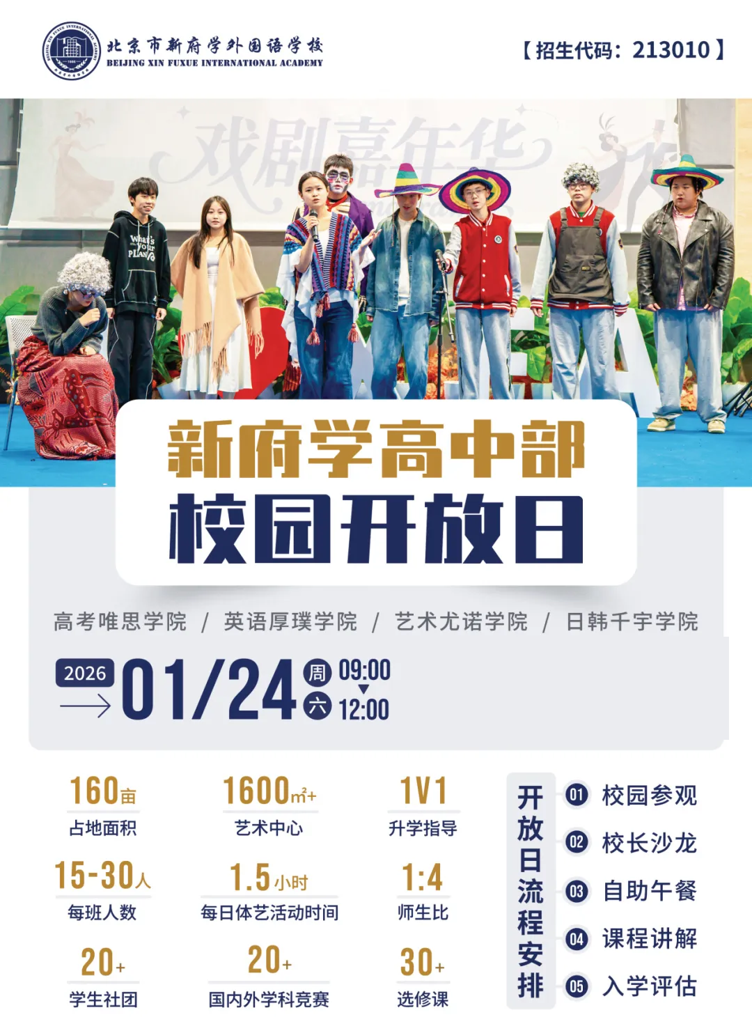 为了让家长们进一步了解我们,缓解择校焦虑,新府学高中部将于1月24日(周六)开展校园综合开放活动,包含参观校园、课程咨询、校长面对面、入学评估、升学规划指导、自助午餐等。
