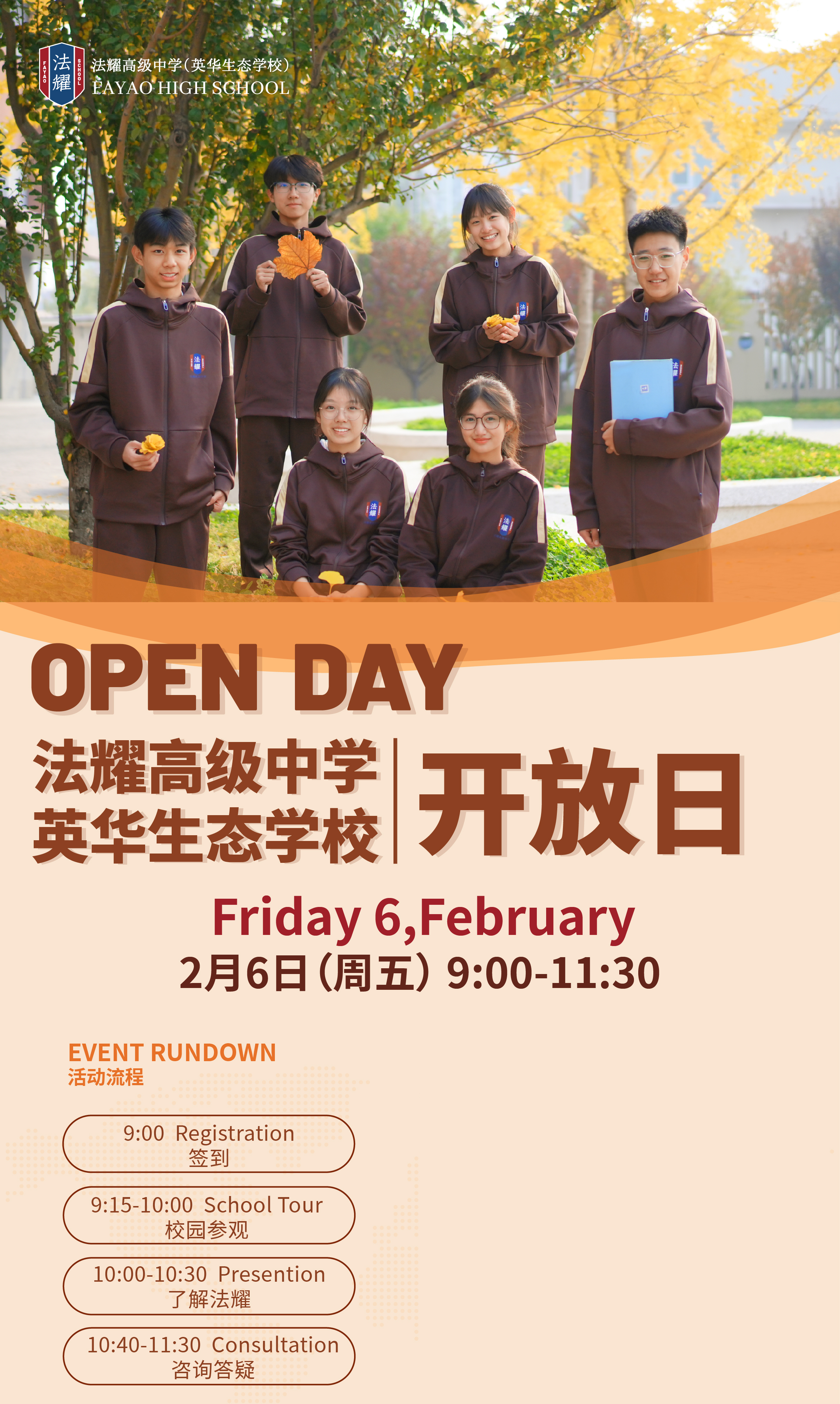 法耀高级中学(英华生态学校)将于2 月 6 日(周五)9:00-11:30举办开放日活动,邀请学生及家长走进校园,了解学校办学情况。