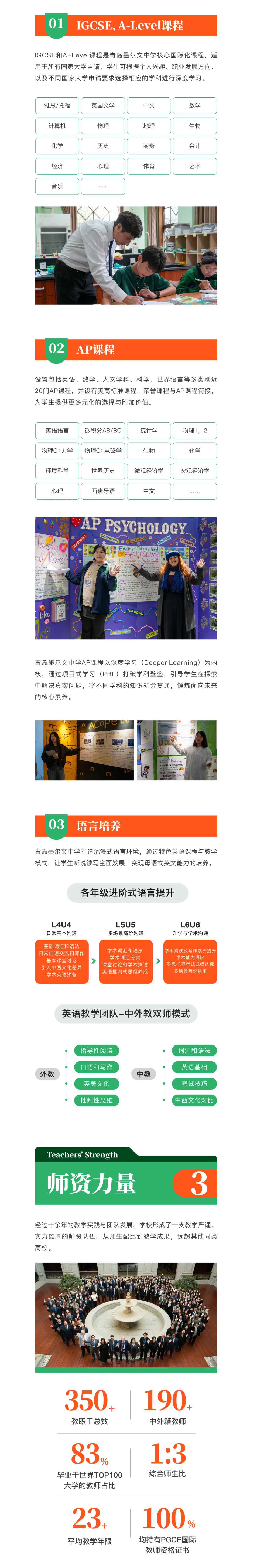师资力量经过十年发展,学校拥有一支教学严谨、实力雄厚、经验丰富的教师队伍,师生配比达 1:3.远超同类学校。来自世界各地的教师不仅助力学生进入理想学校,还为学校带来多元文化,深受学生和家长认可。目前学校在校生超 1000 人,外籍教师占比 60% 以上,是山东省颇具规模和美誉度的民办学校。