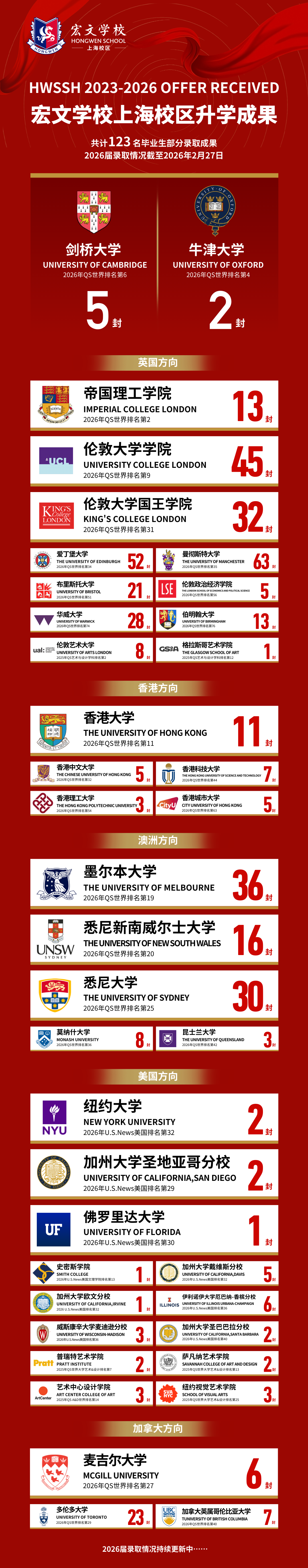 2026申请季,截至目前,上海宏文已经收获了3封牛剑offer,2026届58位高中毕业生斩获包括帝国理工、UCL、香港大学、复旦大学、墨尔本大学等在内的世界Top 30高校offer80+枚,申请Top 50高校的同学全部拿到了offer!