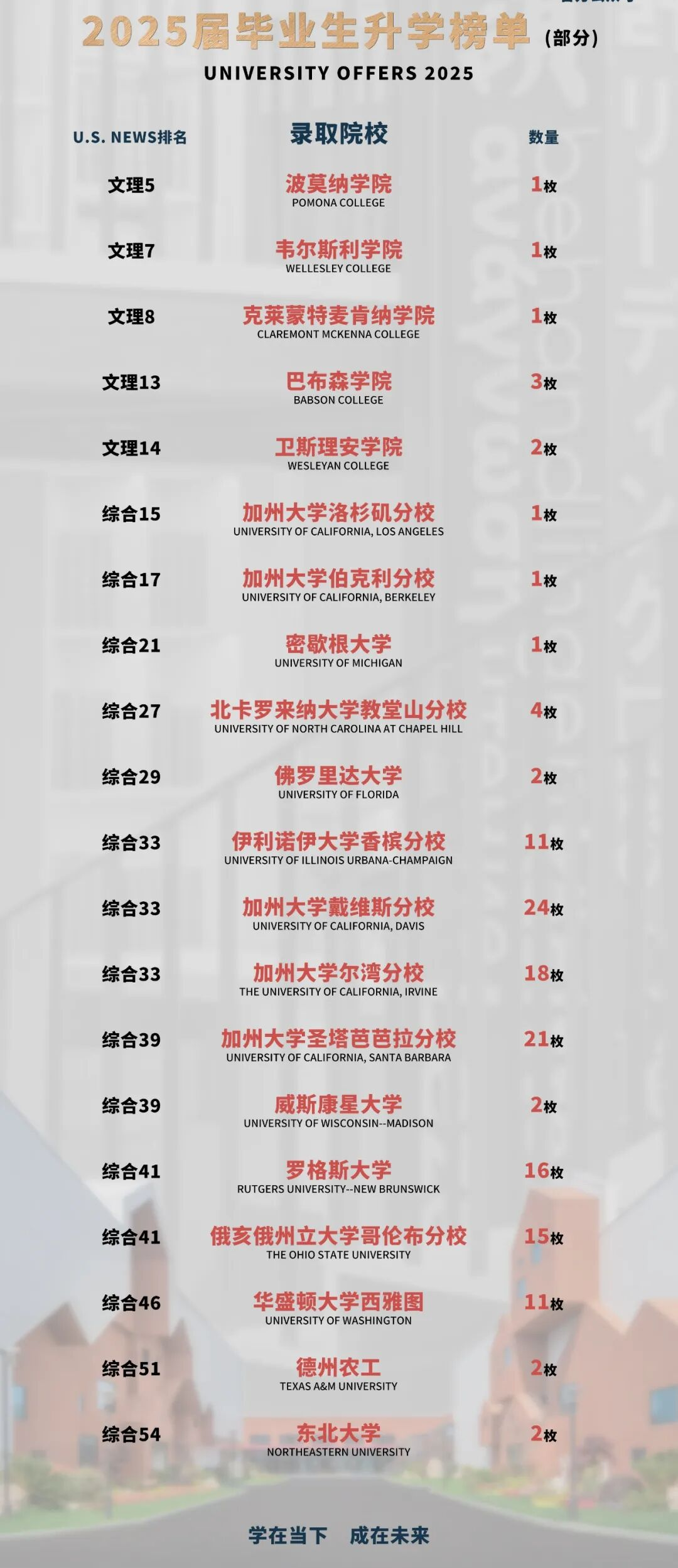 - 伊利诺伊大学厄巴纳-香槟分校、威斯康辛麦迪逊分校(均为综合36)、俄亥俄州立大学哥伦布分校(综合41)、罗格斯大学等一众TOP50院校均有录取入账;