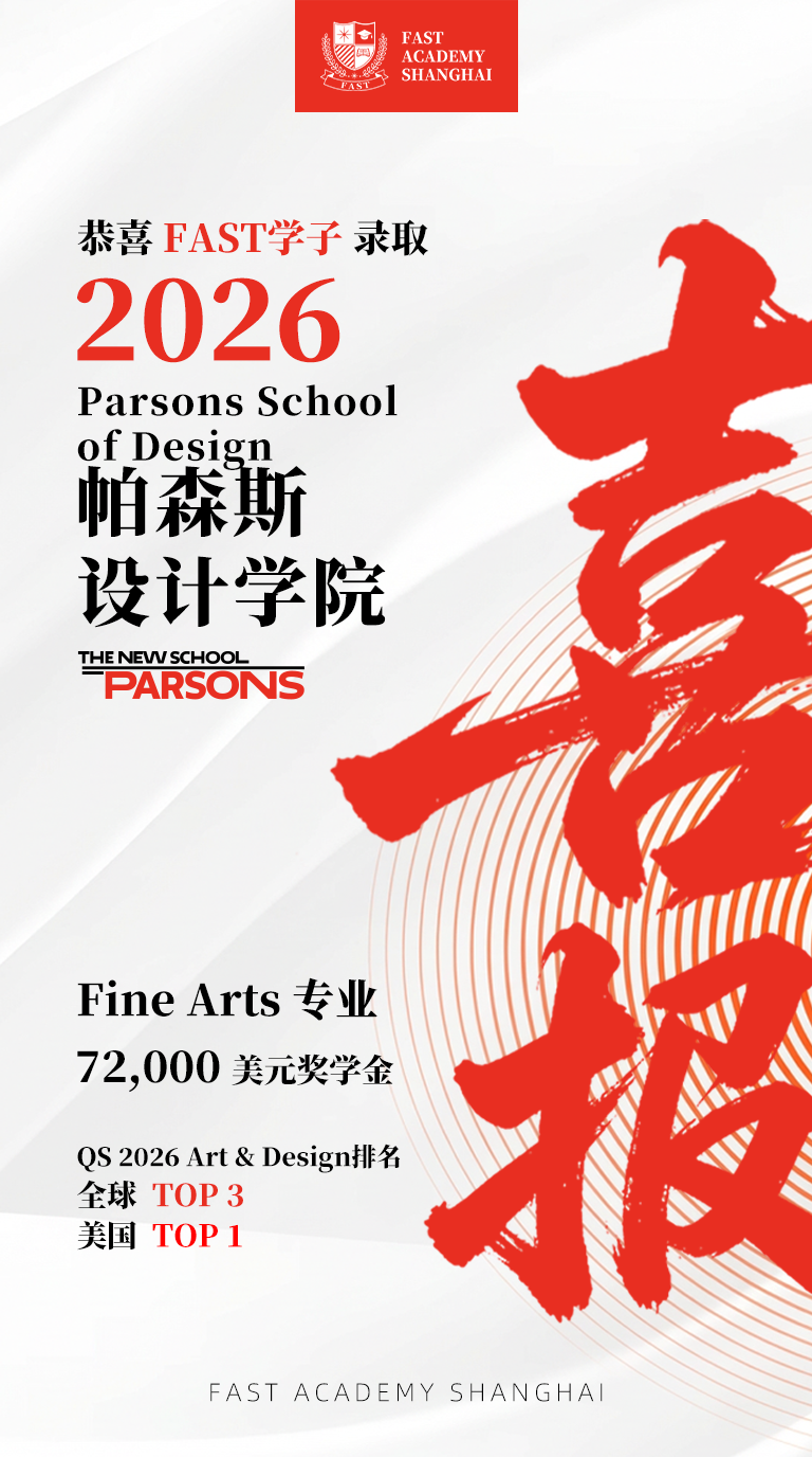 FAST学子接连斩获帕森斯设计学院、芝加哥艺术学院、普瑞特艺术学院等美国头部艺术学院录取,多名同学斩获丰厚奖学金,累计斩获近30万美元,艺术方向录取兼具数量与质量。