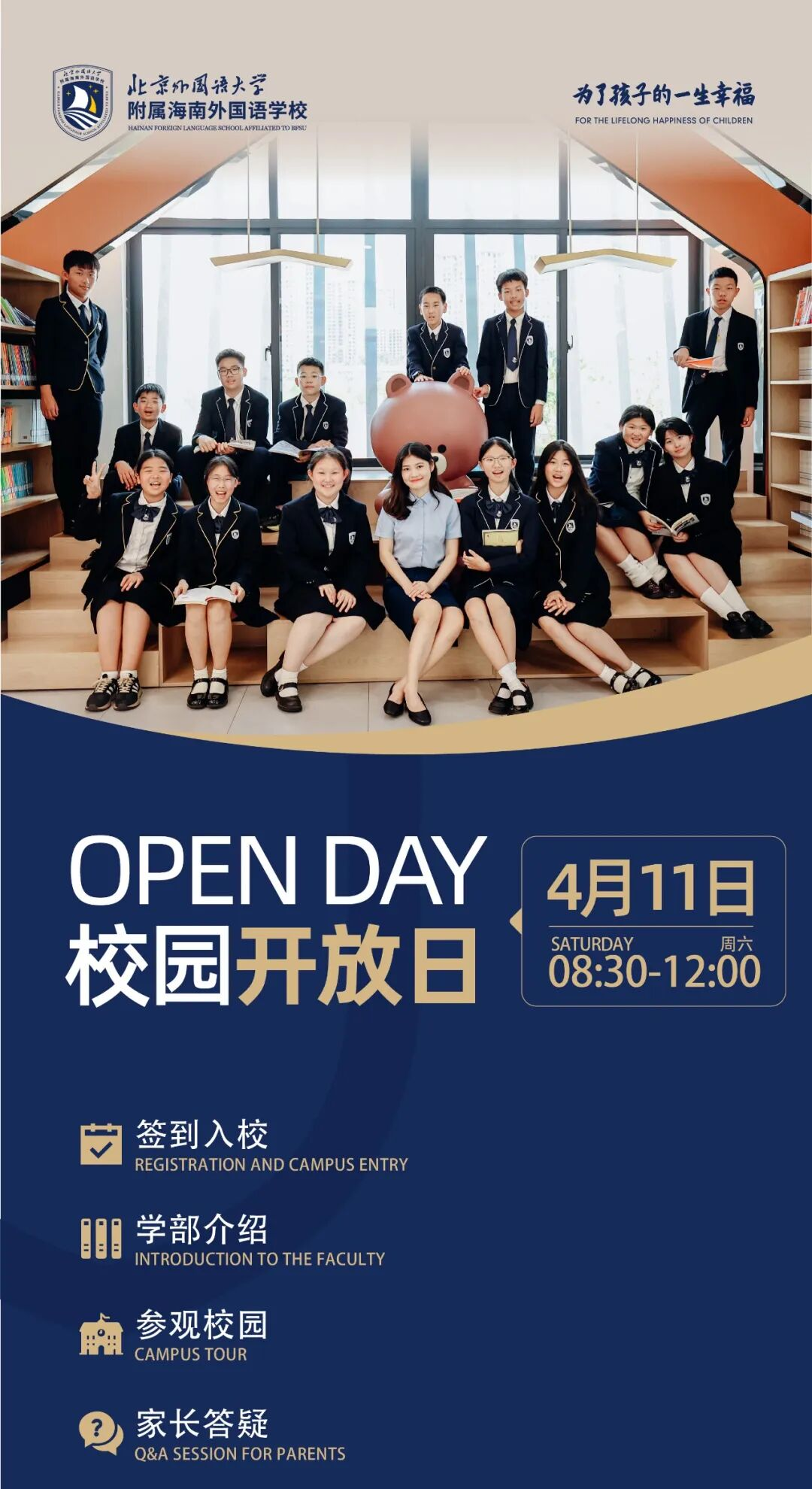 北京外国语大学附属海南外国语学校将于2026 年 4 月 11 日(周六)08:30-12:00举办校园开放日活动,覆盖小学部、中学部,邀请学生及家长走进校园,了解学校办学特色与育人方向。