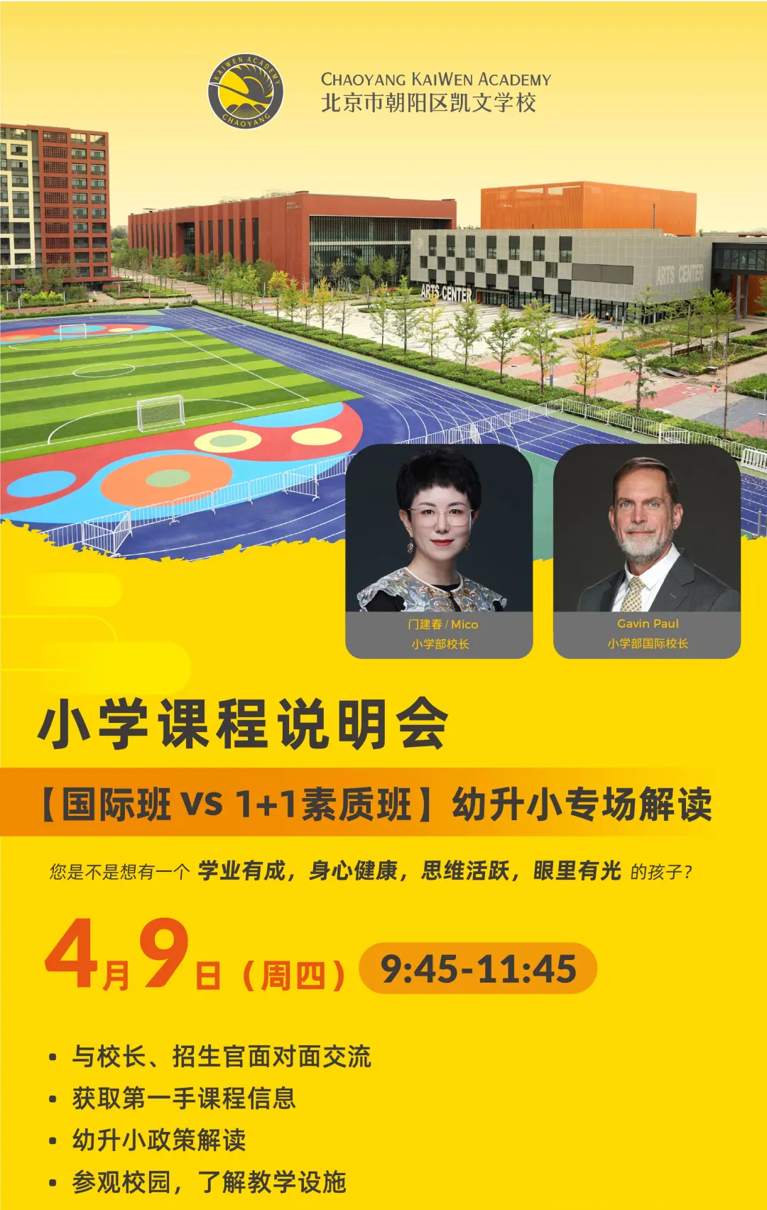 纵观朝阳凯小学课程体系,优势在于孩子们可以在足够早的时候,探索、调整、选择适合自己的节奏,您是不是想有一个学业有成、身心健康、思维活跃、眼里有光的孩子?4月9日的北京市朝阳区凯文学校课程说明会和小学部校长面对面,幼小专场解读,双轨路径的抉择。