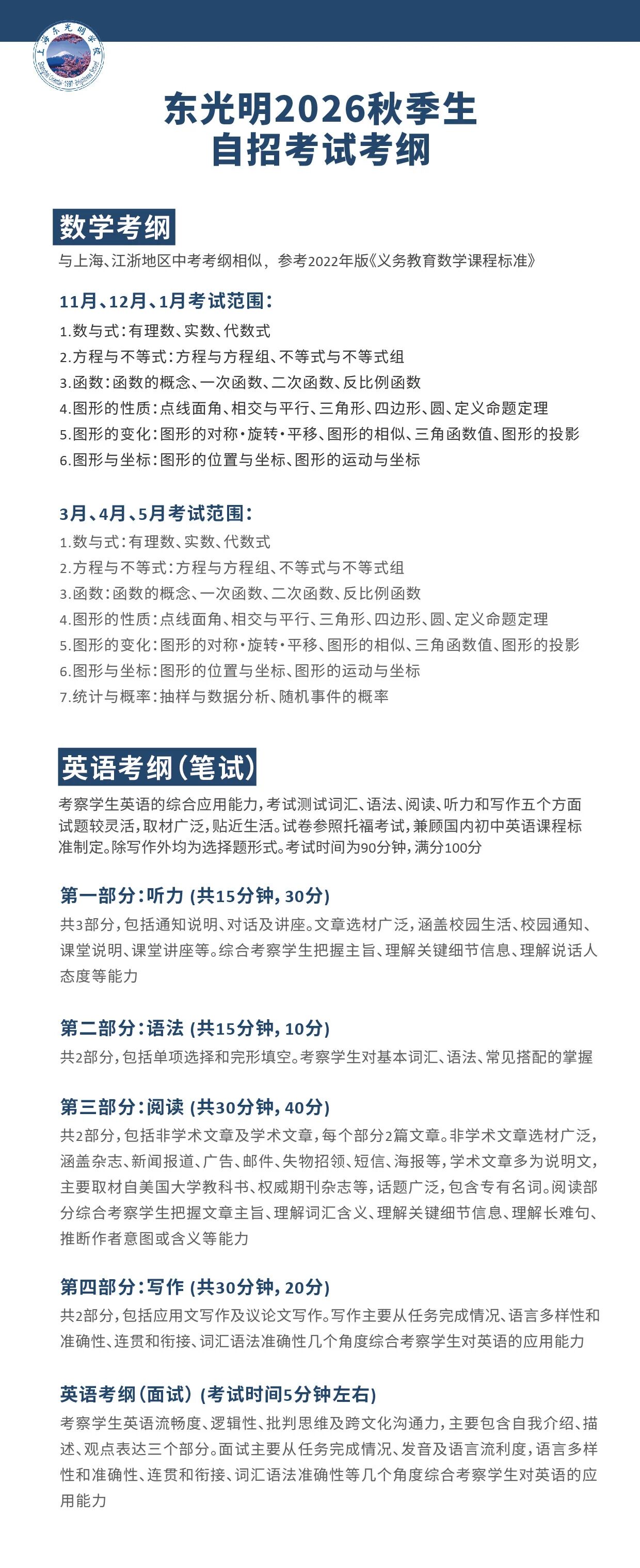 东光明2026秋季生自招考试考纲