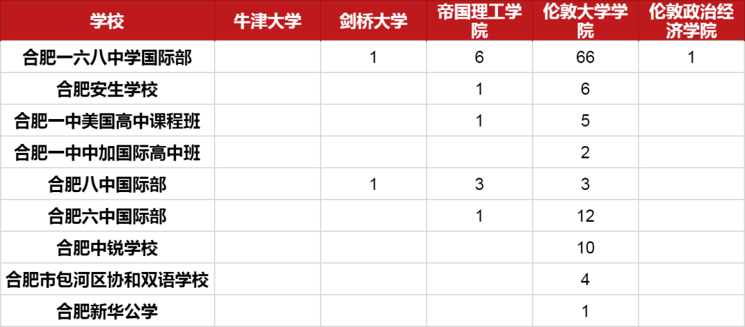 截至目前,合肥9所学校共获得124枚英国G5大学录取,其中有2枚剑桥offer,分别来自合肥一六八中国际部和八中国际部。在UCL录取方面表现尤为突出,累计获得100+录取通知书。