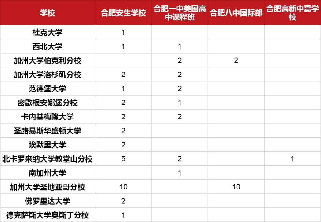据不完全统计,今年合肥4所学校共斩获57枚美本TOP30录取,其中包括杜克、西北等头部高校,充分展现了其办学实力。