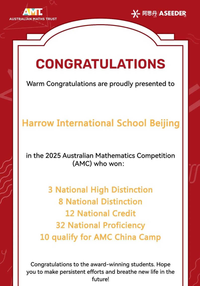2025 澳大利亚 AMC 成绩出炉,哈罗北京学子再次刷新战绩!恭喜3位同学斩获全国一等奖,直接跻身全球考生前 3%!另有 8位 同学拿下全国二等奖,稳居全球前 20%。更厉害的是,有10位数学小天才成功晋级澳洲 AMC 中国站集训营,他们将在更高舞台上与全国高手过招! 此外,还有12个三等奖和32个技能奖收入囊中。
