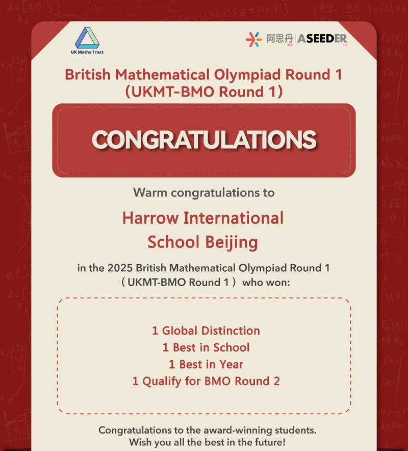 在英国数学协会系列挑战赛中,哈罗学子凭硬核实力斩获多项荣誉:1项全球杰出荣誉、1项全校最佳荣誉、1项年级最 佳荣誉、1人成功晋级英国数学奥林匹克第二轮(BMO Round 2),BMO Round 2难度极高,是通往国际奥赛的关键选拔。