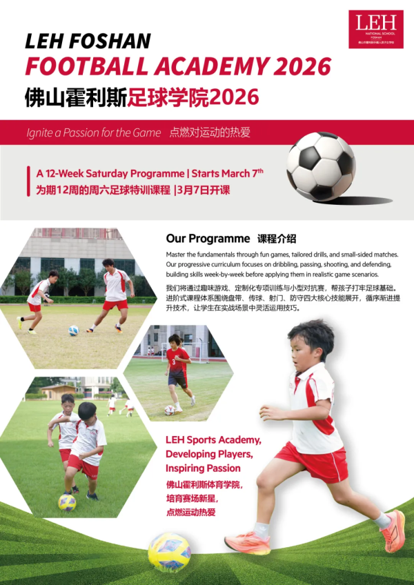 这个春天,足球将成为助力青少年成长的伙伴。佛山市霍利斯外籍人员子女学校旗下的佛山霍利斯足球学院宣布2026年度特训课程正式启动。本次课程开放范围进一步扩大,不仅面向佛山霍利斯在校学生,社区内的青少年也可参与。为期12周的周六专属训练将于3月7日开课。