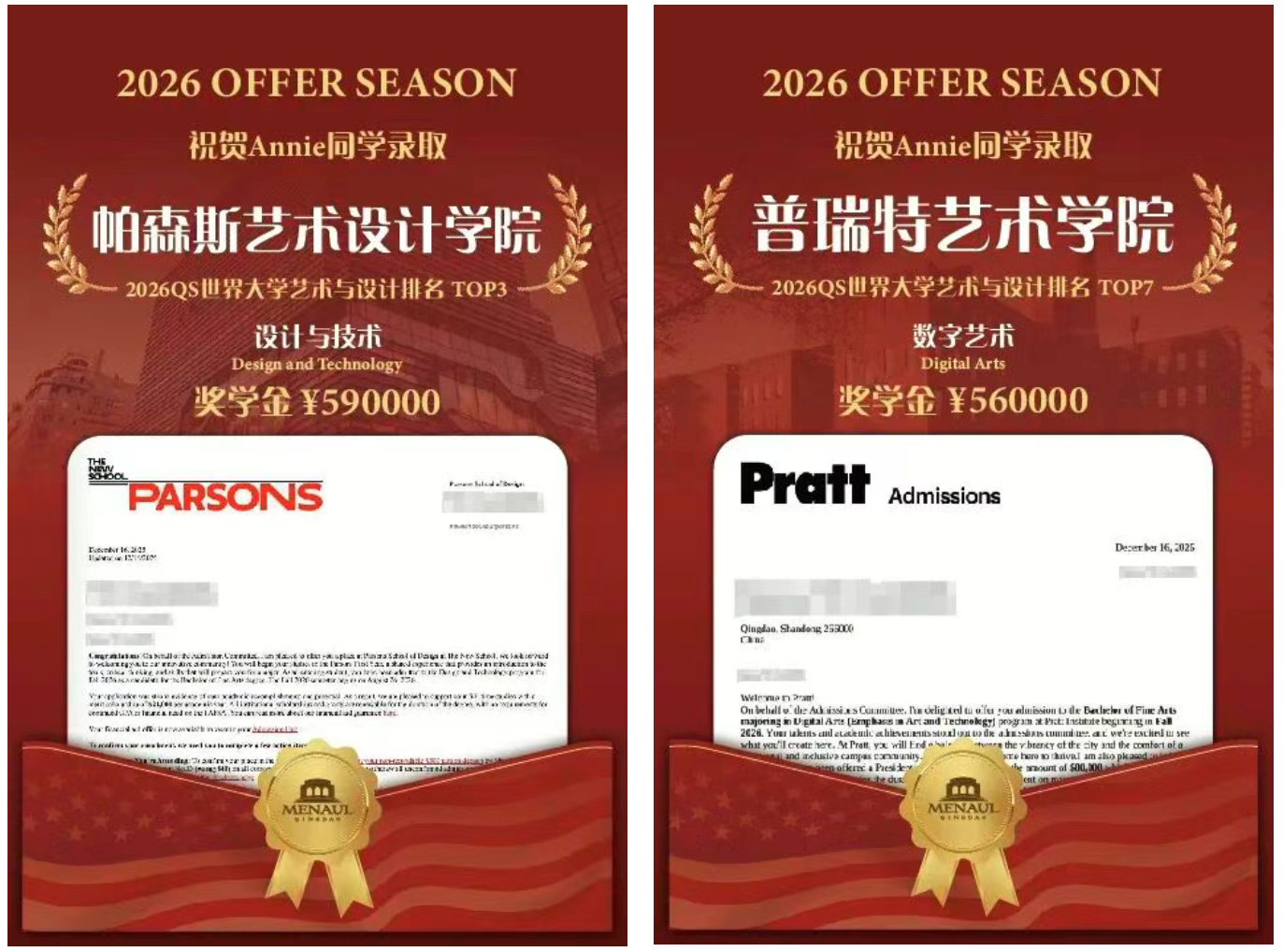 恭喜Annie同学同时收获两所美国艺术设计界“顶流”的青睐。