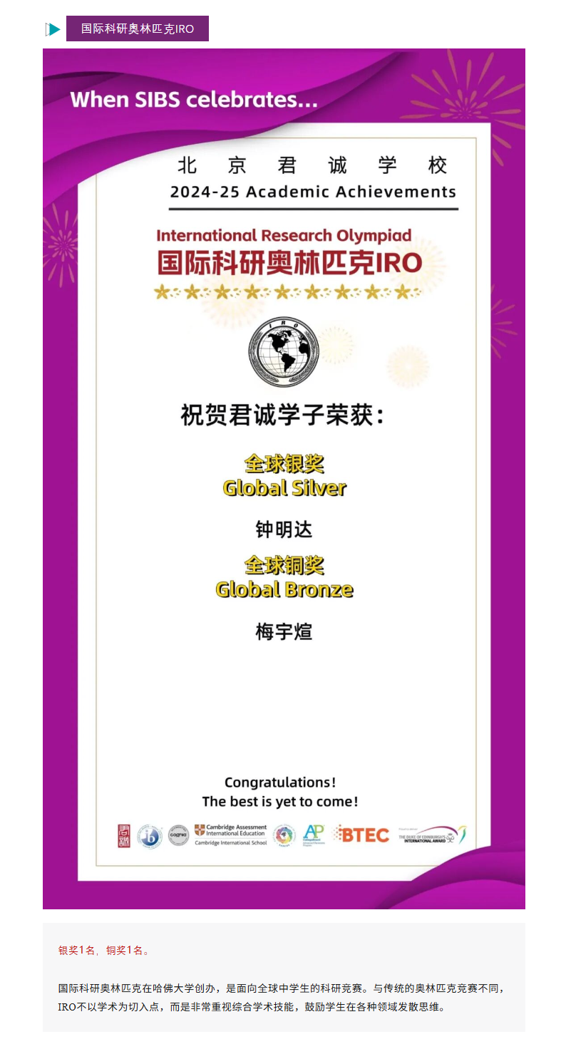 国际竞赛是大学申请中不可或缺的一部分,是君诚学校国际课程体系中非常重要的一环,也是君诚学子展示“学术硬实力”的舞台。在2024-2025学年即将收尾的时刻,全球各类竞赛喜讯纷至沓来,君诚学子表现抢眼,全面开花!