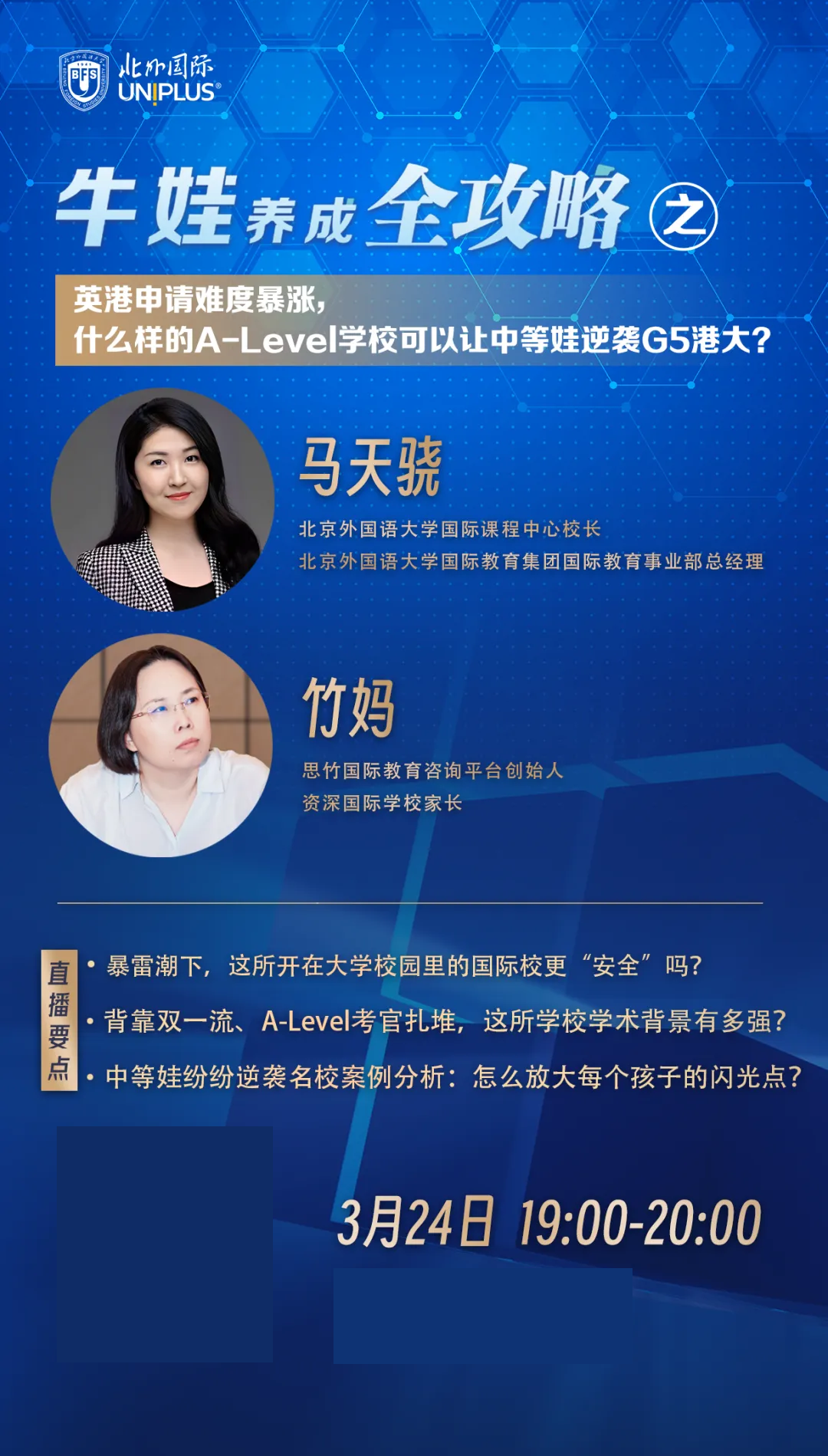 不过,3月24日(周二)19:00 - 20:00,北外ICC校长马天骁将与思竹国际教育咨询平台创始人竹妈共同带来一场直播。竹妈深耕国际教育领域多年,每年助力几百个家庭完成国际教育规划与择校,对北京各类国际学校及海外私校情况十分了解。