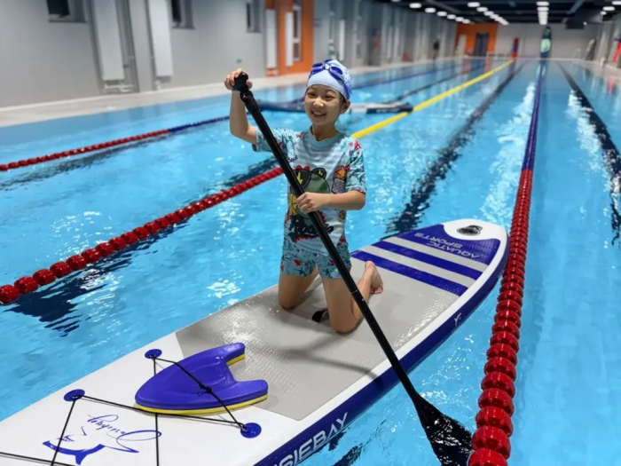 初中阶段实现能力与体验双重升级:在巩固泳姿基础上,通过间歇训练、长距离续航提升速度与耐力,完成从“会游”到“游好”的跨越;更创新性引入水球与桨板项目——水球运动锻炼团队协作与灵活应变能力,桨板练习考验平衡感与核心力量。