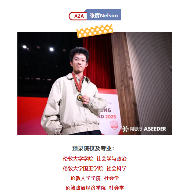 Nelson 被预录的院校及专业包括:伦敦大学学院的社会学与政治、社会学,伦敦大学国王学院的社会科学,伦敦政治经济学院的社会学。他在课堂上能与老师从容对话,舞台上唱歌也十分坦荡,瘦瘦的他身上仿佛带着光。