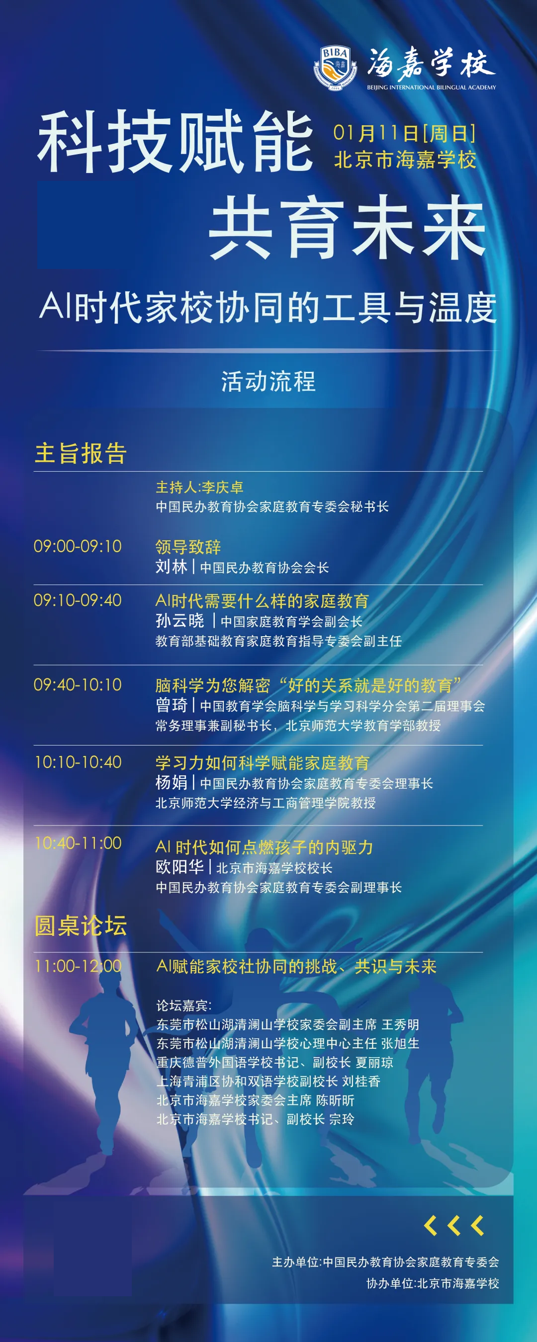 在此,我们郑重宣布:由中国民办教育协会家庭教育专业委员会主办的“科技赋能,共育未来——AI时代家校协同的工具与温度”学术论坛暨第三届理事会将于2026年1月11日在北京市海嘉学校隆重举行。