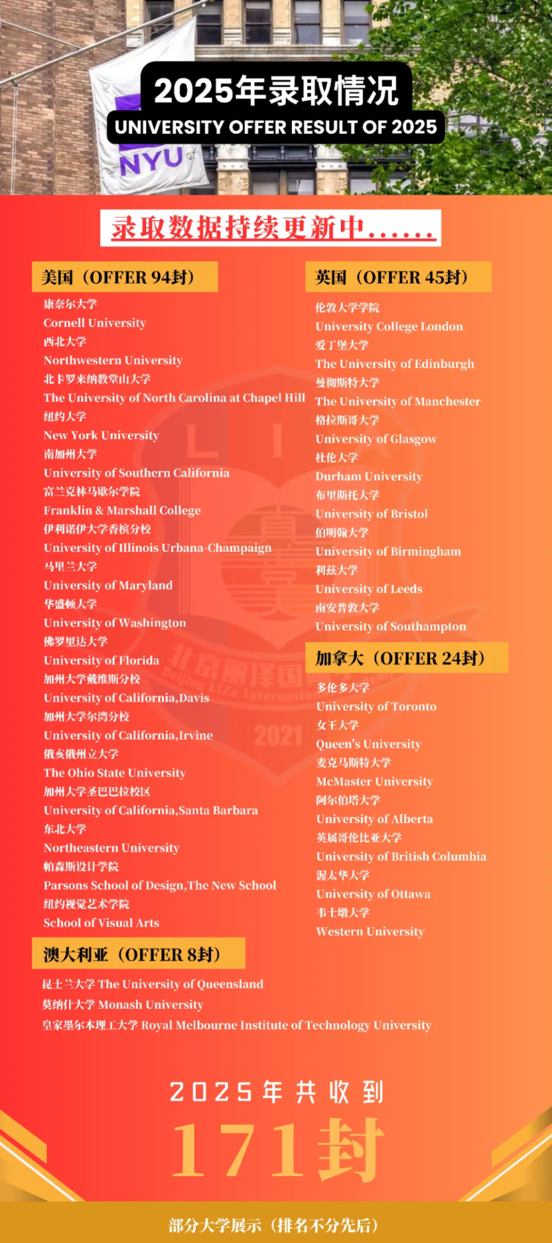 截至当前,2025届丽泽学子已斩获美、英、加、澳等全球主流留学国家171封大学录取通知书,累计奖学金总额突破605万元人民币。尤为值得关注的是,2025届毕业生喜获常青藤学校康奈尔大学录取,更有全美前10的西北大学录取。除常青藤学校外,2名同学获得世界QS排名前10的伦敦大学学院 UCL的录取。截至当前,本届毕业生均获得了海外大学的录取通知书,39%的录取来自世界/美国前30强大学,82%的录取锁定世界/美国前50强席位。