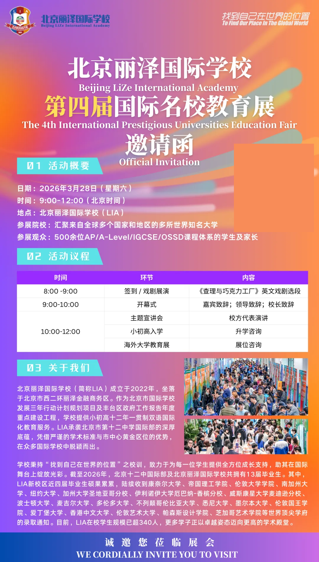 北京丽泽国际学校诚挚邀请各界人士参加该校第四届国际牛校教育展。历经三届的沉淀与积累,备受瞩目的第四届国际牛校教育展即将盛大开启。此次教育展汇聚了来自11个国家的50所院校,构建了一个覆盖小学至大学全阶段的升学咨询平台,为有志于走向国际舞台的学子们搭建起一座桥梁。