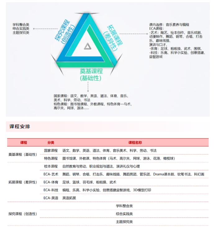 小学部实施国家课程,深度融入多元文化元素,结合校本特色课程,开设了奠基课程、拓展课程和探究课程三类课程体系。此外,还有 “5 + 领域特色培养” 课程,包括语言 +、艺术 +、科技 +、健康 + 和实践 +。这些课程旨在帮助学生发展建构知识能力、道德推理能力、创新思维能力、解决问题能力以及沟通合作能力等高阶能力。