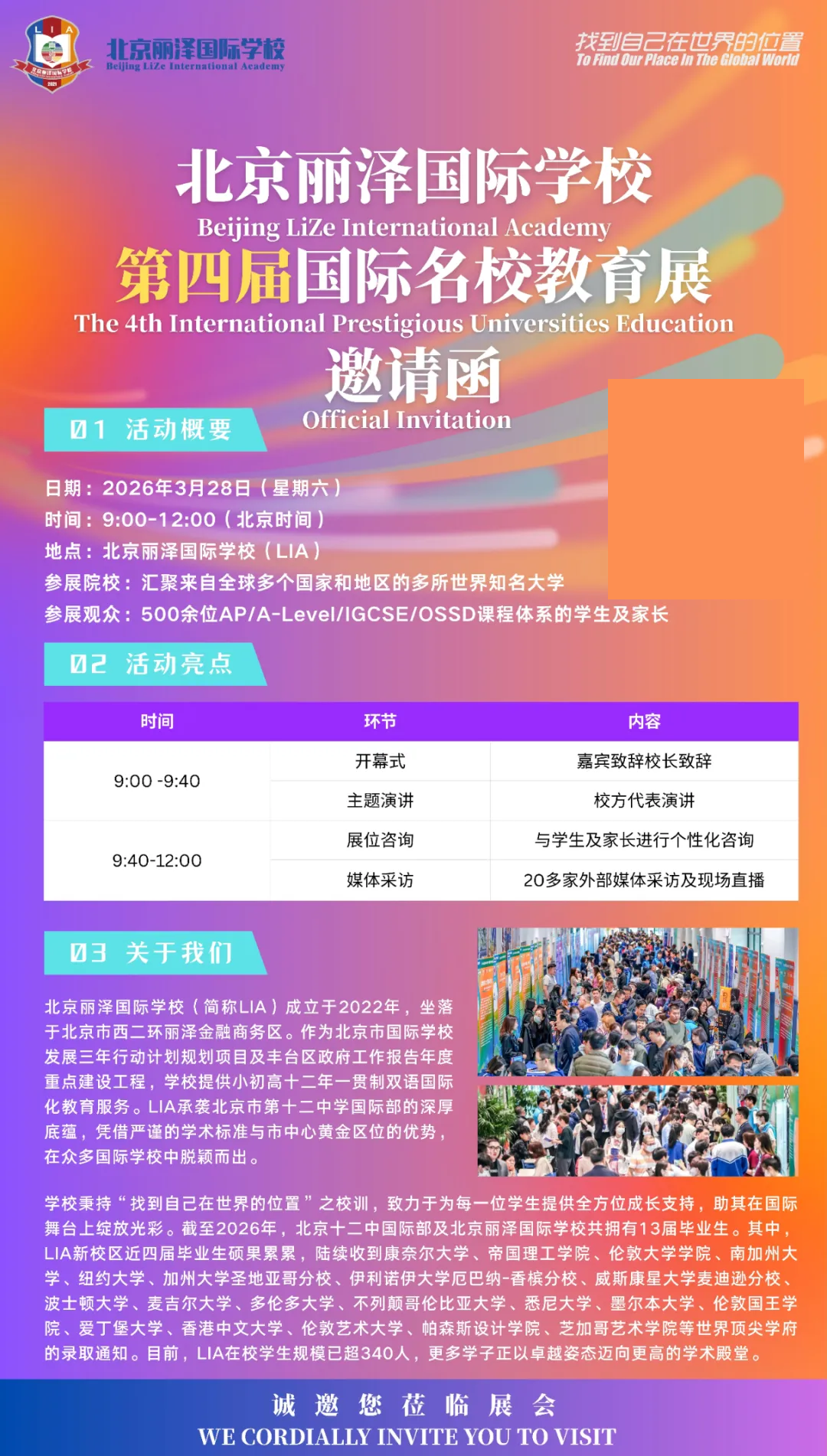 活动时间为 2026 年 3 月 28 日(星期六)9:00-12:00.地点为北京丽泽国际学校,建议提前规划出行时间,准时到场。