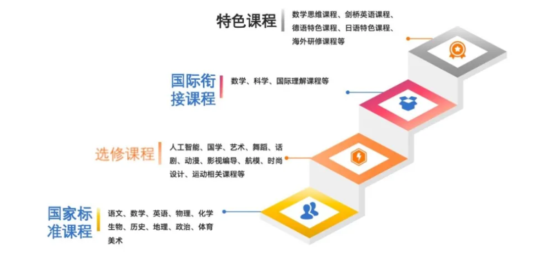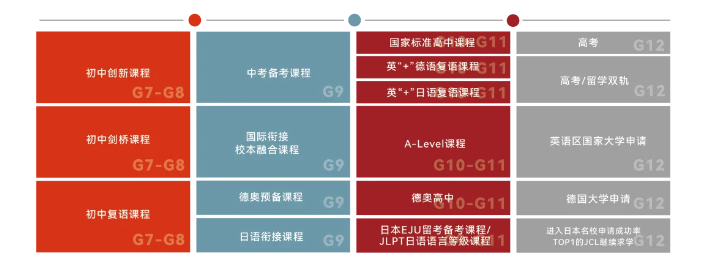 国际升学赛道:德语班衔接德国DSD项目,通达德国高中-莱茵鲁尔中学;日语班对接日本EJU留考课程,与JCL等机构合作保障升学;剑桥班对标A-Level课程,毕业生可申请英、美、澳等多国高校。