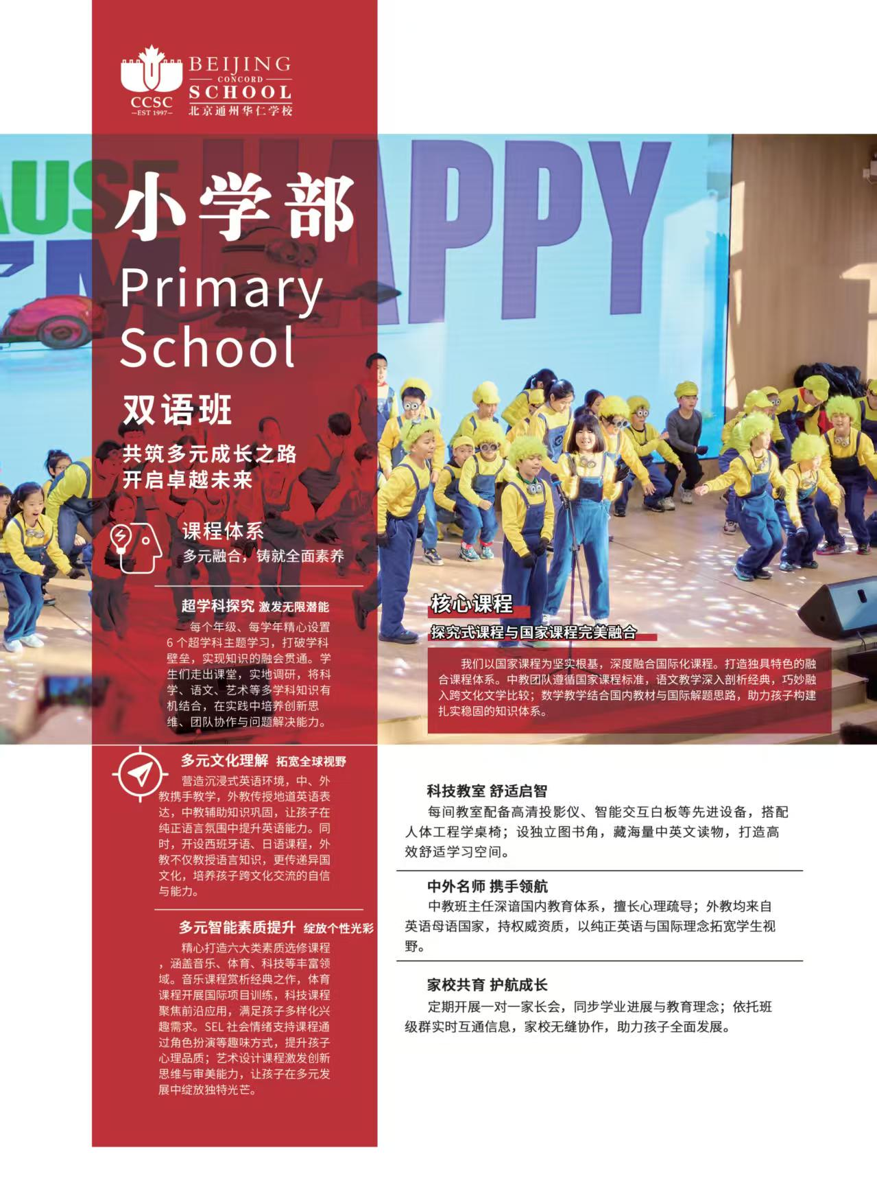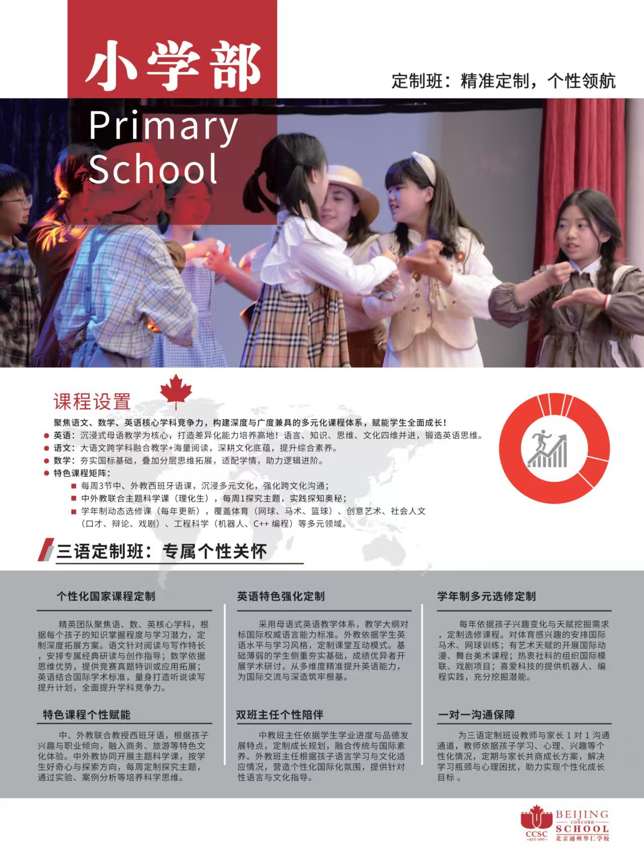 北京中加学校小学部以“共筑多元成长之路,开启卓越未来”为理念,构建多元融合的课程体系。以国家课程为根基,深度融合IB课程精髓,中教夯实基础、外教传递国际理念;每学年设置6个超学科主题探究,打破学科壁垒,搭配英语沉浸式教学及多语种课程,拓宽孩子全球视野。同时开设六大类素质选修课程,兼顾兴趣与素养,助力个性绽放。
