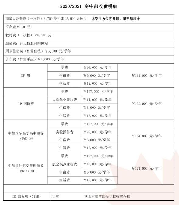 北京中加学校成立于1997年,学校坐落在北京市通州区丛林庄园,整体教学环境非常不错。目前北京中加学校高中开设了加拿大,医学预科,航空等方向课程,课程多样性丰富程度都是可以的。及其很多家长有咨询中加学校高中学费,下面我们来看看北京中加学校2020-2021学年学费标准吧。