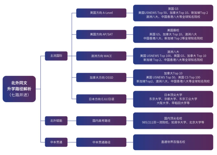 (4)加拿大、澳大利亚等方向,开设安省课程、WACE课程等,学生注册海外学籍,课程同步。与海外400余所大学建立稳定合作关系。