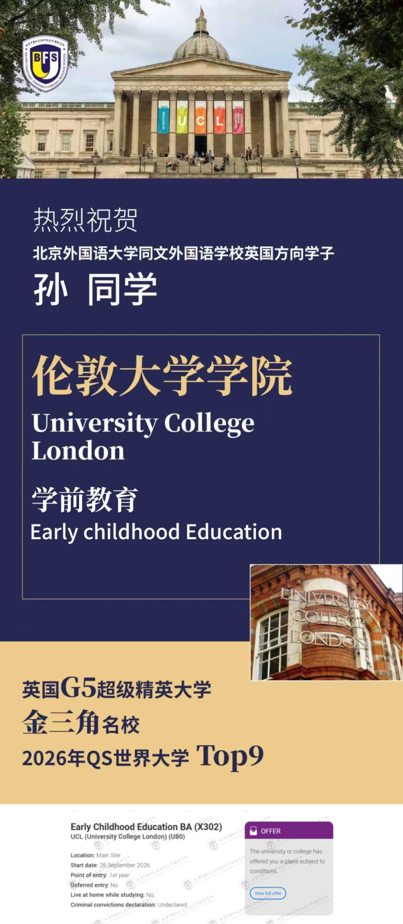 捷报频传,荣耀再续!北外同文孙同学凭借出色的学术表现、丰富的实践经历与突出的综合素养,在激烈的全球申请竞争中脱颖而出,成功收获伦敦大学学院(UCL)录取通知书,圆梦世界学府。此次录取不仅是对孙同学长期努力与优异实力的充分肯定,也再次彰显了北外同文学子强劲的升学竞争力,为更多追梦学子树立了优秀榜样。