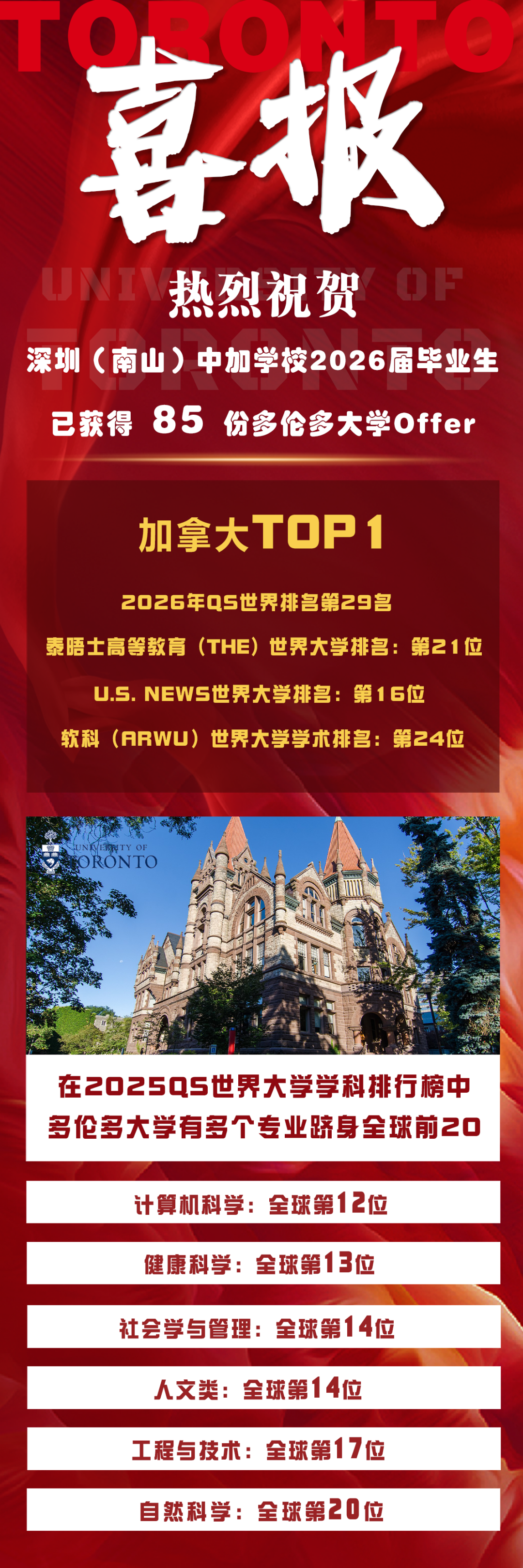 深圳(南山)中加学校特别恭喜12 - 3班张晗钰同学收到多伦多大学世嘉堡校区11万加币奖学金;