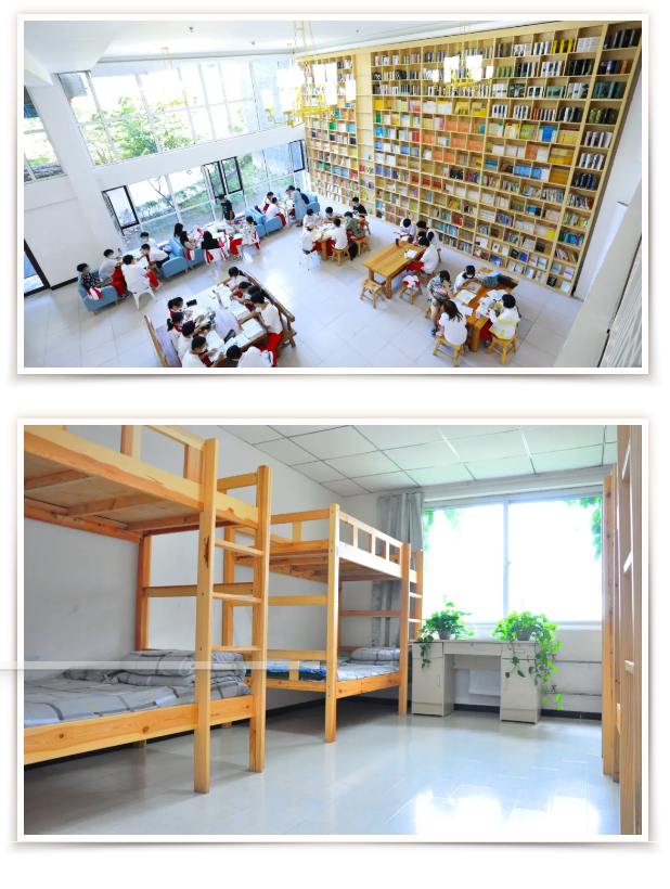 ●宿舍:除了住宿外,楼内还设有图书馆、钢琴、咖啡角、生活区、健身区、练舞区等硬件设施,无论休息还是周末留校,孩子们静可喝咖啡、下棋、阅读,动可弹琴、健身、跳舞,生活丰富多彩。