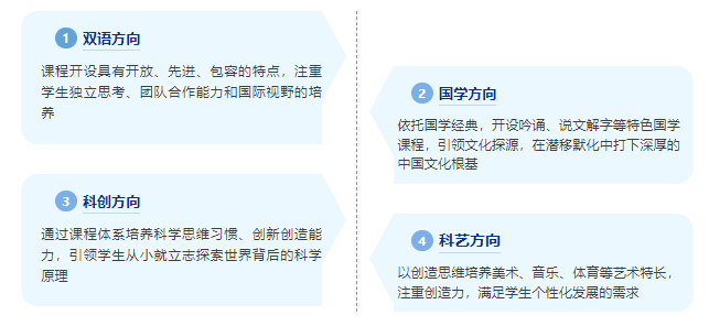 语言课程:基于学生语言学习特点及阶段性学习能力,以剑桥英语、美国英语强化课程为参考,再将课程本土化,着力提高学生的语言听说读写能力。