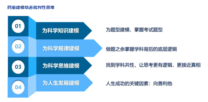 ●建模高效:以学生面对的各类问题为素材,通过归纳、分析、演绎,不断建立、升级思维模型,打通新旧知识壁垒,丰富思考视角,完善知识系统,提升解决未来各类问题的能力。