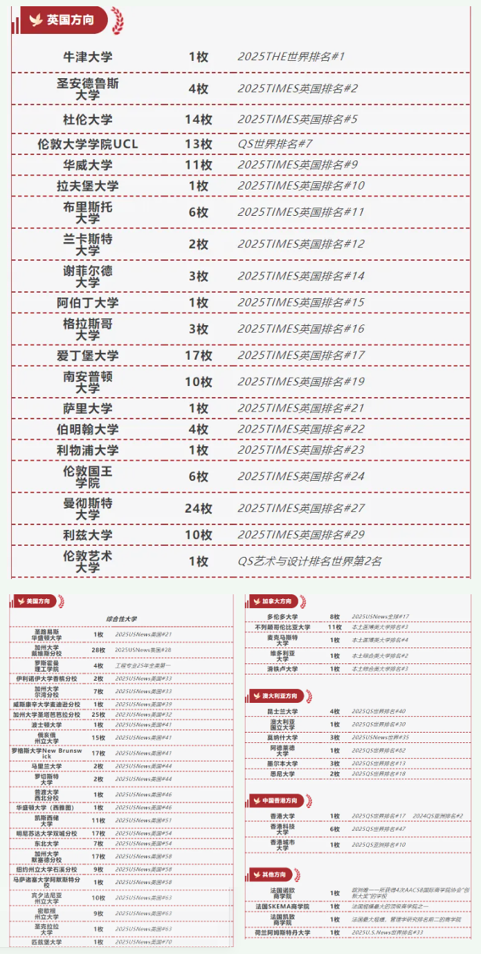 2025届毕业生共69位同学,共收到来自牛津大学、圣路易斯华盛顿大学、香港大学、香港科技大学、多伦多大学、墨尔本大学等在内全球89所高校的430封录取通知书。世界Top90录取率97%,申请美国方向96%毕业生获Top60录取,申请英国方向毕业生获Top30录取。