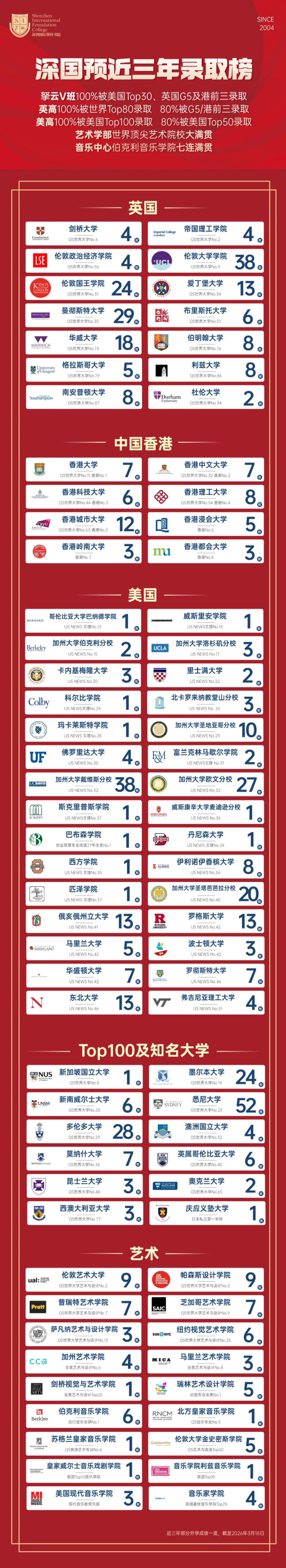 深国预海外大学升学率达99.9%。从80、90后,到00、10后,深国预迄今培养了四代学子走向世界,遍布英美港澳加新瑞等国家和地区的全球高等学府。包括:哈佛、斯坦福、哥大、芝大、JHU、康奈尔、南加大、UCLA、UCB、卡内基梅隆、纽大、剑桥、帝国理工、伦敦政经、UCL、爱丁堡、多大、澳大利亚国立、新加坡国立、港大、伦艺、罗德岛、帕森斯、Berklee等。学校秉持教育长期主义,众多毕业生在学校继续深造(攻读硕士、博士学位)。 每一代的蜕变,都是 “一个学生一套教育方案” 理念的生动印证。