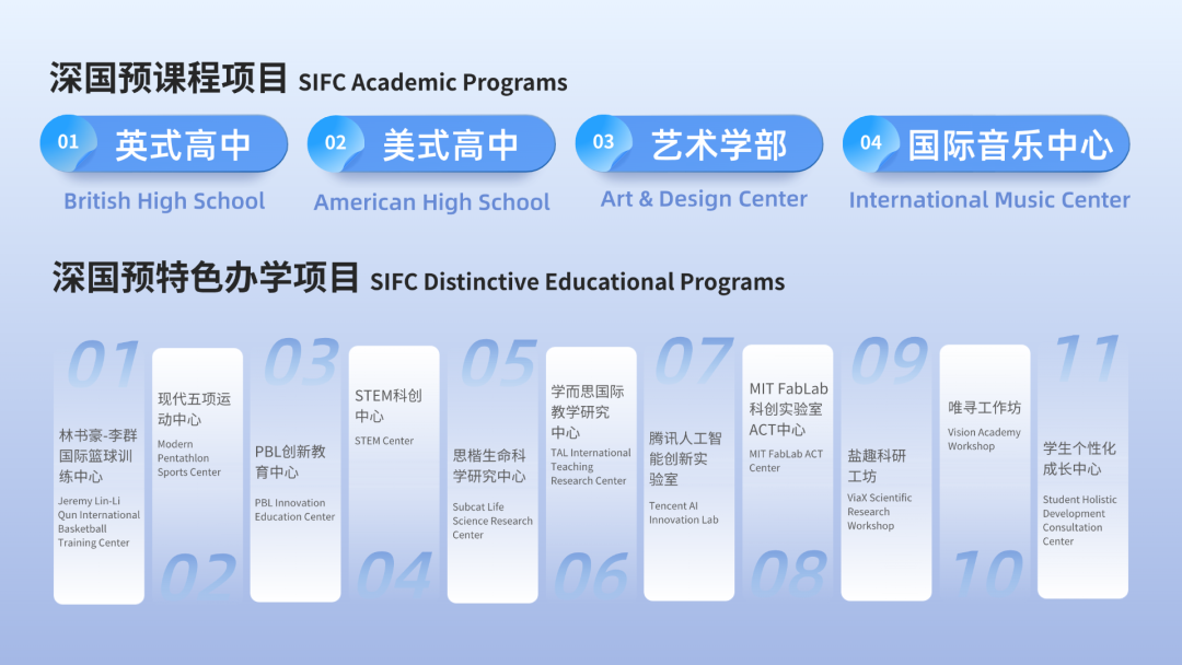 在深国预,我们构建美高、英高、艺术、创新多元贯通的课程体系,推行 “书院+X” 多维协同育人模式,正是为了实现 “一个学生一套教育方案”“教育因人而设”的目标;超高师生比则确保 “每个学生的个性需求被充分关注”,让 “不做流水线、只塑独特个体” 的承 诺落地。通过将教学与服务做到极致,深国预以 “真个性,真教育” 激励学生探索热爱,帮助每一个 “唯一” 找到适配的成长路径,兑现 “定制每一个学生的成长力” 的教育初心。我们塑造打磨每一个孩子,在深国预“预”见最 好的自己!