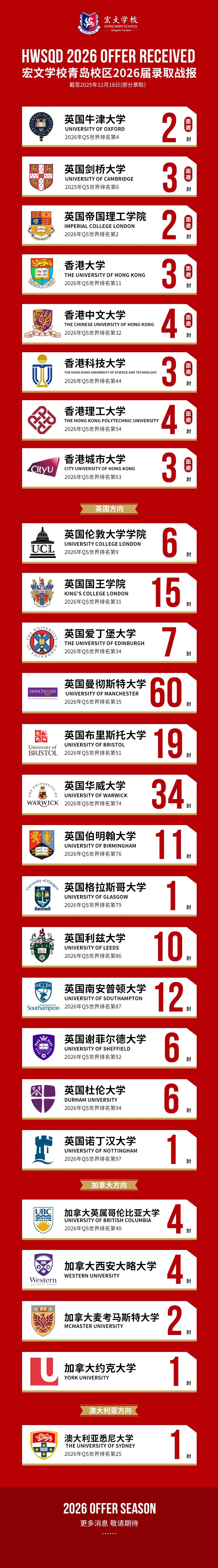 截至12月18日,宏文学子在2026申请季已收到24封高校面邀,以及224封Offer。