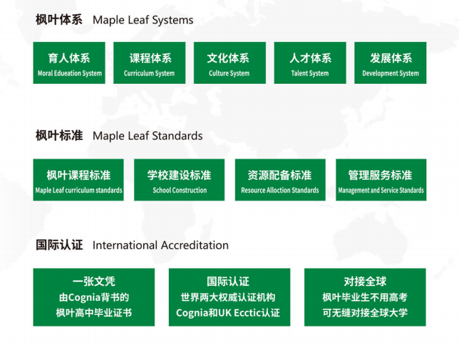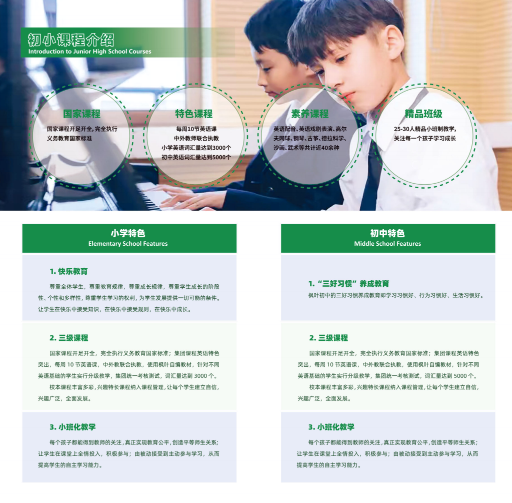 济南枫叶学校于2019年9月正式开学,是枫叶教育集团在第25个城市开办的第100所学校。学校遵循“中西教育优化结合,实施素质教育”的办学理念,开设国家规定的九年义务教育课程,同时开设枫叶英语校本课程、社会实践课程、兴趣特长课程。25至30人的小班化教学确保了学生在课堂学习和课外活动中得到足够的关心与支持。 枫叶在实践中探索出高中“一张文凭,两方认证,对接全球”的教育模式,升读国内外学校;初中阶段实行“一个引领、三级课程、两个目标”的教育模式;小学阶段实行快乐教育,确保了枫叶课程模式质量和学生全面发展。同时,济南枫叶小学、初中将移植枫叶英语分级教学体系,小学实行六级英语,初中实行三级英语,实施分级教学走班上课。