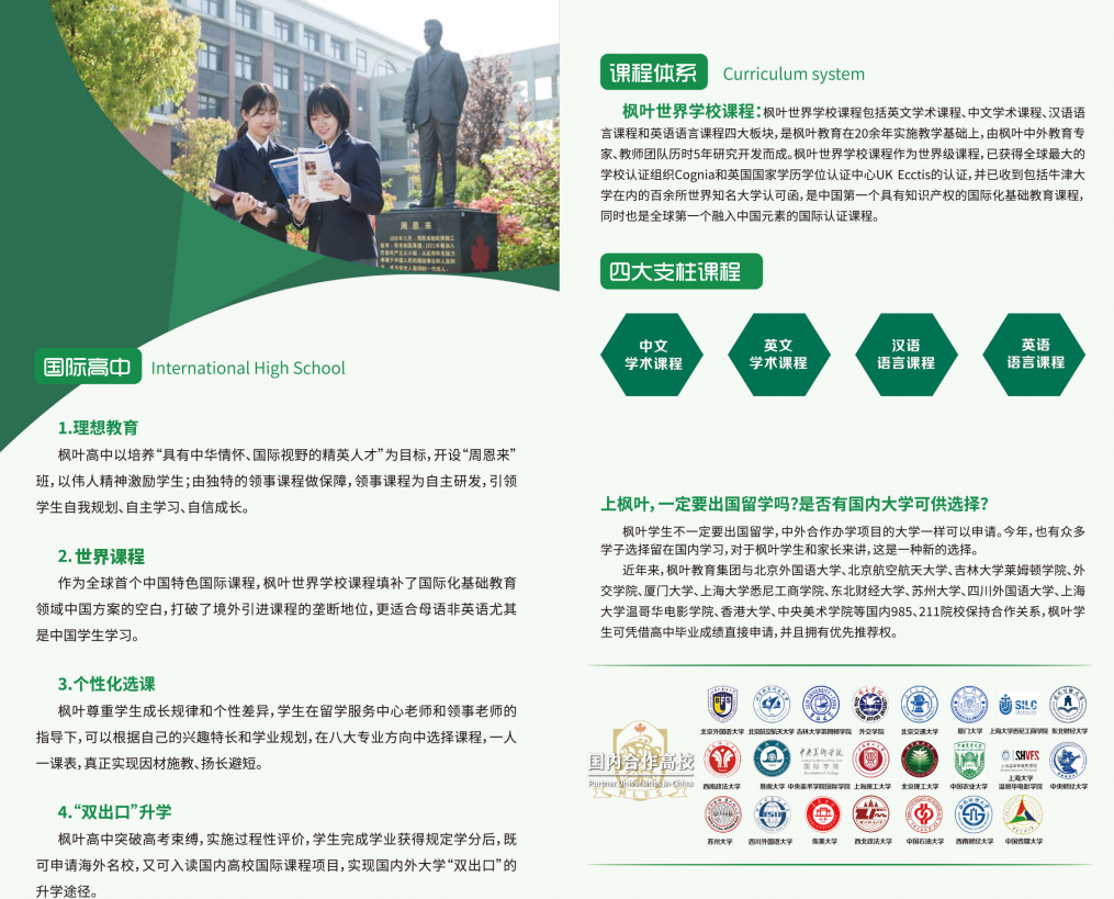 枫叶教育集团秉承“中西教育优化结合,实施素质教育”的办学理念,致力于不分种族、肤色、国籍,为所有受教育者提供一流教育服务的使命。在先进文化和理念指引下,枫叶培养了一批批国际精英人才,致力于成为中国颇具影响力的国际教育品牌。