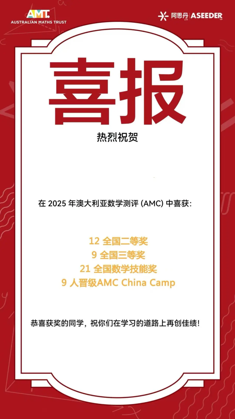 在2025年澳大利亚数学测评(AMC)中,墨尔文教育表现优异。其中,12人荣获全国二等奖(前25%),9人凭借优异成绩晋级澳大利亚数学集训营中国站,另有9人获得全国三等奖。