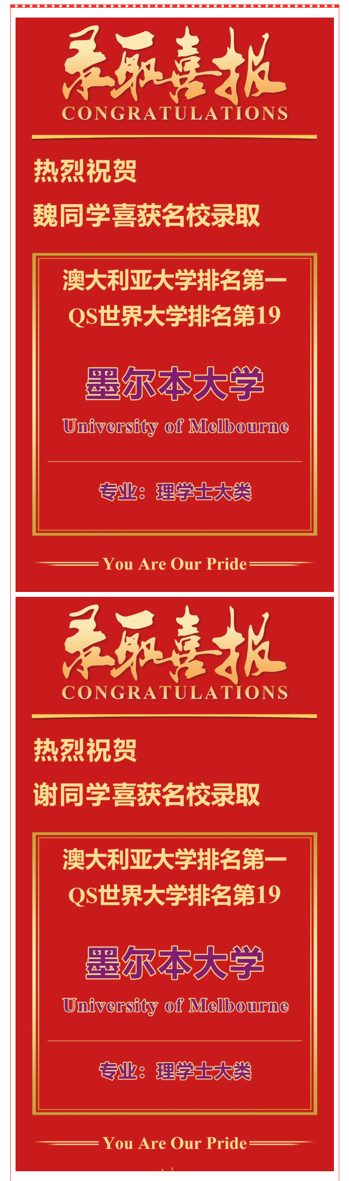 喜讯再次传来!本校魏同学、谢同学凭借出色的综合素质与扎实的学业表现,双双获得澳大利亚学府——墨尔本大学(University of Melbourne)的录取!