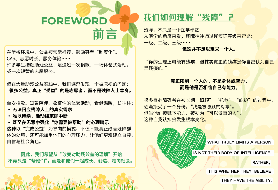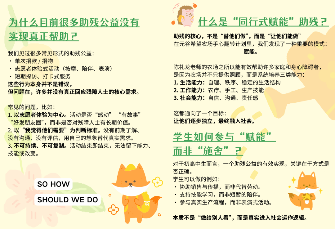 三是设计一套工具包,包括助残公益手册、活动策划指南、访谈技巧和“有效公益自测表”,正与学校沟通纳入CAS教材,让学弟学妹少走弯路。