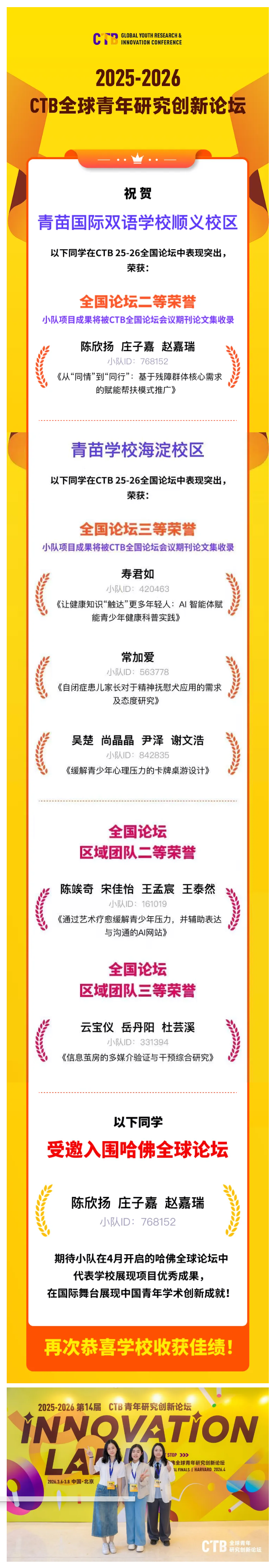 刚刚落幕的2025 - 2026年度CTB全球青年研究创新论坛全国论坛上,青苗学子凭借扎实研究与温暖行动,捧回多项荣誉。青苗顺义校区陈欣扬、庄子嘉、赵嘉瑞同学,以《从“同情”到“同行”》项目,斩获全国论坛二等荣誉,还受邀入围哈佛全球论坛,即将代表中国青年登上世界舞台。这份荣誉背后,有一个值得聆听的故事。
